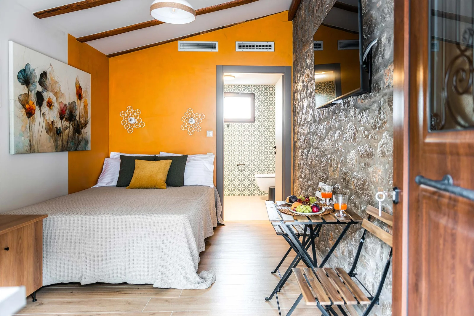 Στο δωμάτιο της Ουρανίας, το φως δεν είναι απλώς φως∙ είναι παρουσία. Χρυσές αποχρώσεις γεμίζουν τον χώρο σαν ηλιαχτίδες που αγγίζουν απαλά τους τοίχους, ενώ το βλέμμα ανεβαίνει φυσικά προς το ταβάνι, σαν να αναζητά τον ουρανό. Εδώ, η ηρεμία φορά το χρώμα του ήλιου και η νύχτα μοσχοβολά σιωπή και όνειρο. Ένα καταφύγιο για όσους αγαπούν να στοχάζονται, να ονειρεύονται και να βρίσκουν την έμπνευση μέσα στο φως.